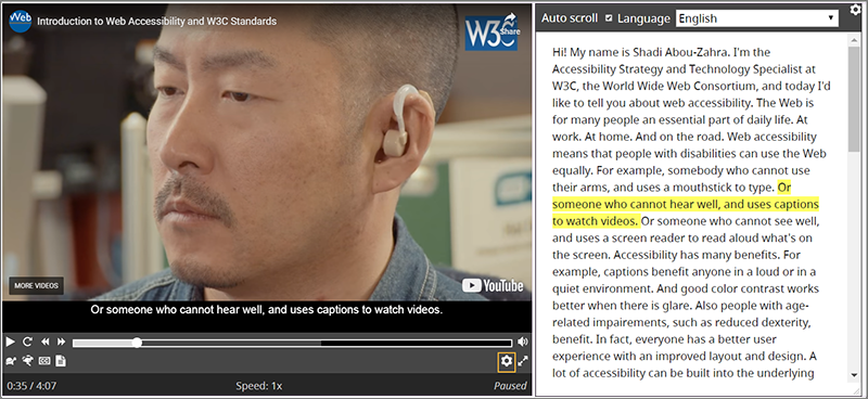 Interactive transcripts use the captions file. Interactive transcripts highlight text phrases as they are spoken. Users can select text in the transcript and go to that point in the video.