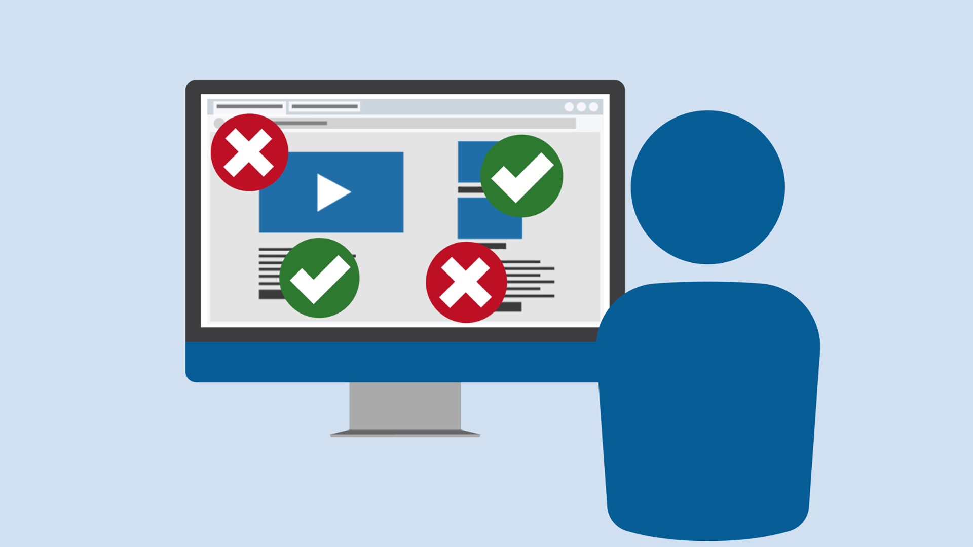 WCAG-EM also recommends involving real users with disabilities during evaluation, to help you address the real-life experience of your website users. | A person in front of a computer displaying a website. Passes and fails are marked. |